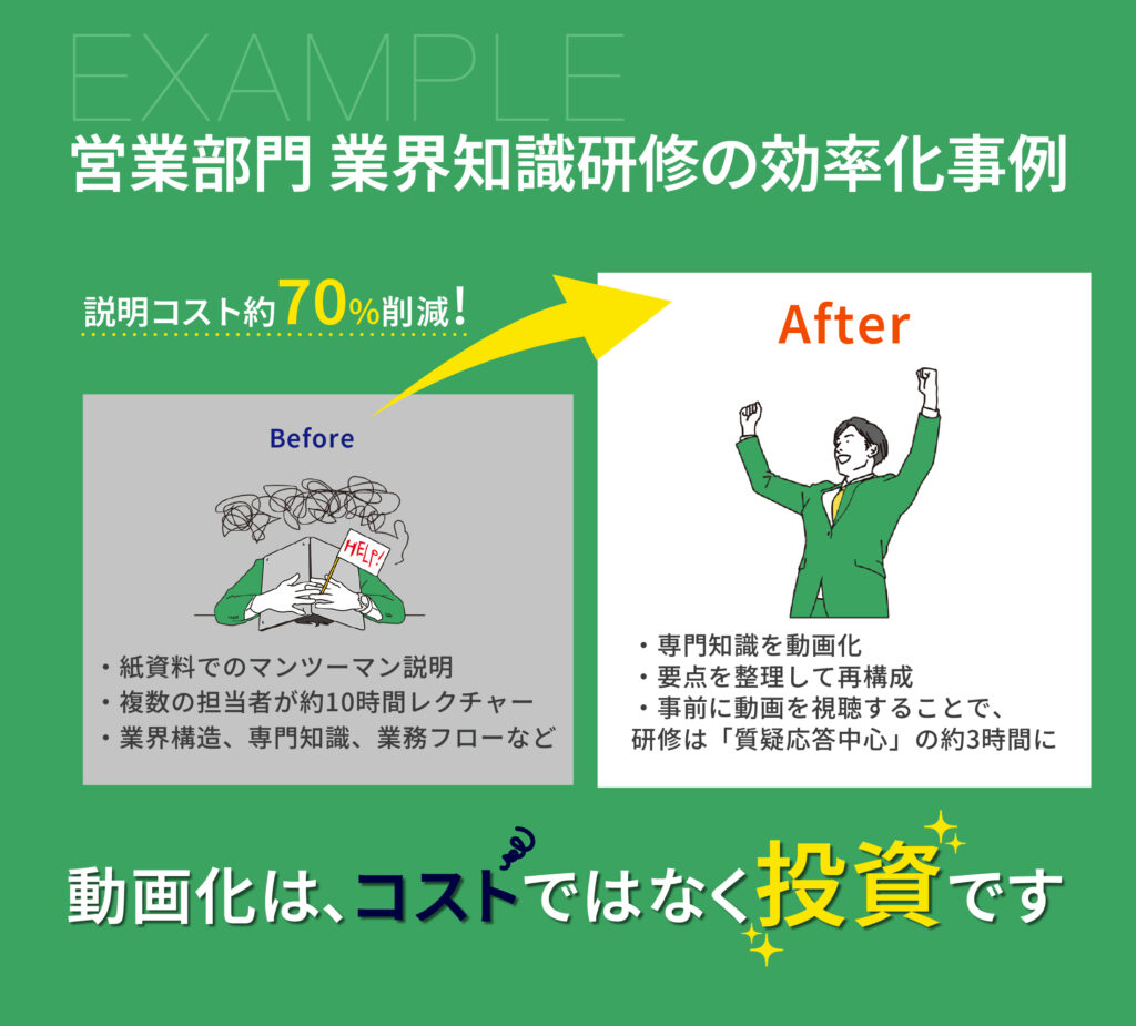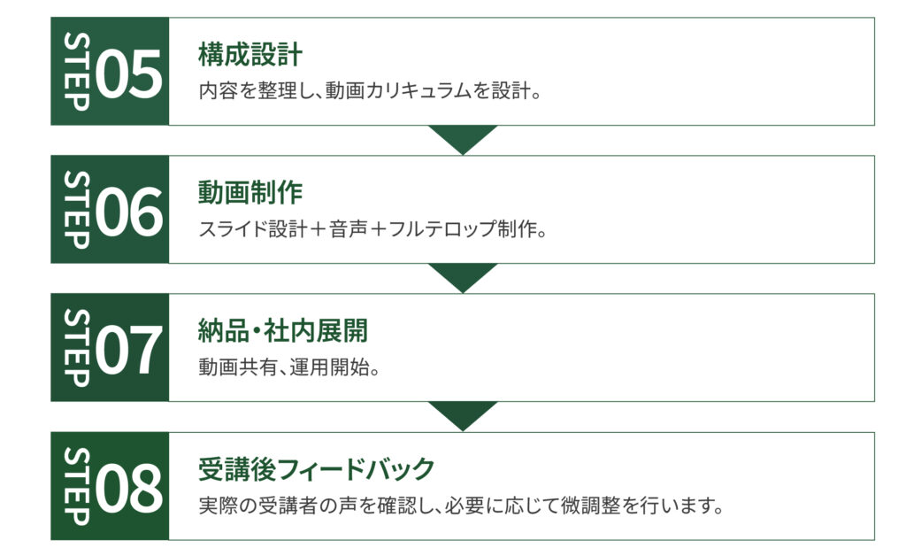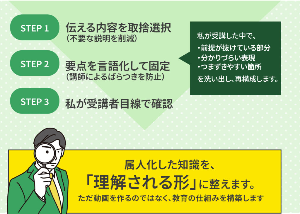 動画は成果物ではありません。・事前学習・研修・異動時の引き継ぎ・法令変更時の差し替えに活用できる、“運用できる教育システム”を構築します