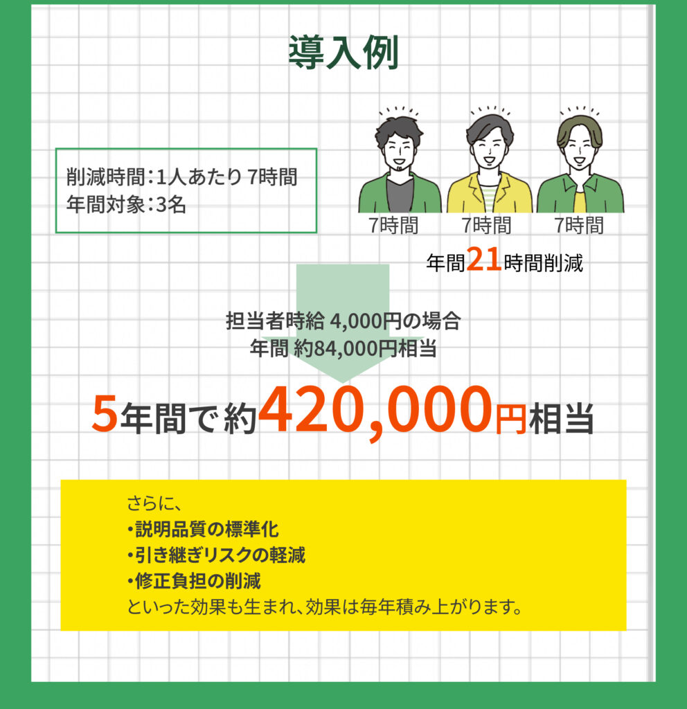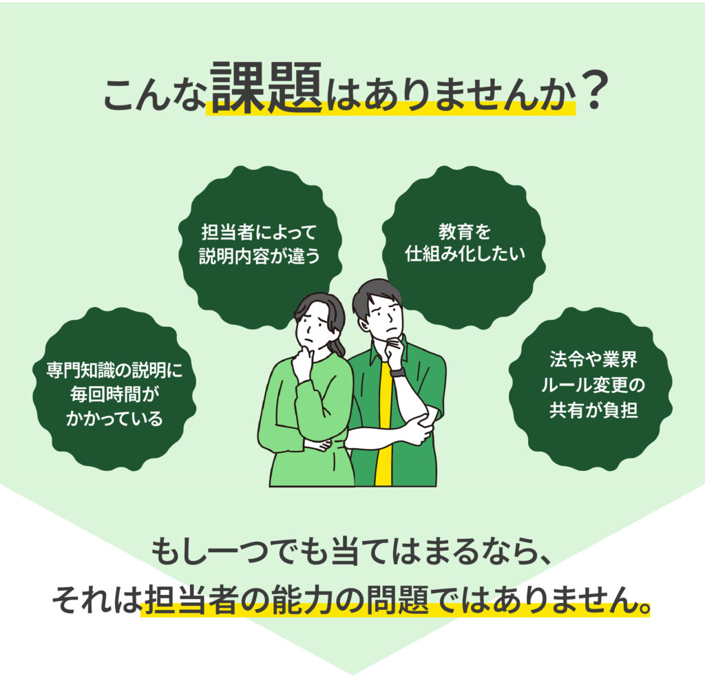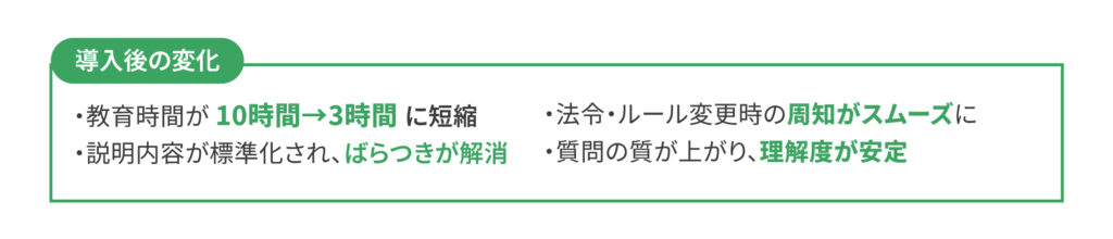 当社は業界特有の専門知識が多く、新人や異動者への説明に毎回多くの時間を割いていました。さらに、法令や業界ルールが変更されるたびに、その内容を正確に共有する必要があり、担当者の負担が大きくなっていました。また、説明する人によって微妙に内容が異なり、「伝わり方」にばらつきが出ることも課題でした。