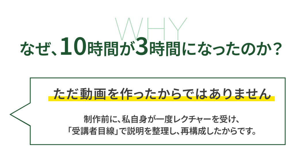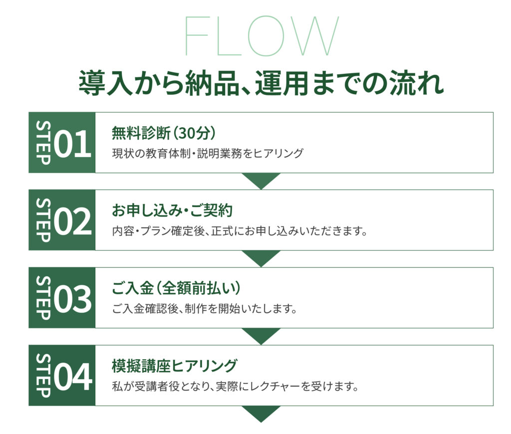 ・動画8本(8~12分程度)・模擬講座形式でのヒアリング(各動画30分)・受講者目線での再構成・フルテロップ・年間伴走サポート込み
